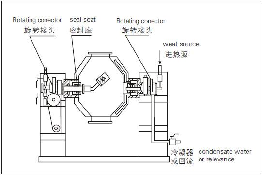 ◎ 在密閉的夾層中通入熱能源(如熱水、低壓、蒸汽或導熱油),熱量經內殼傳給被干燥物料。