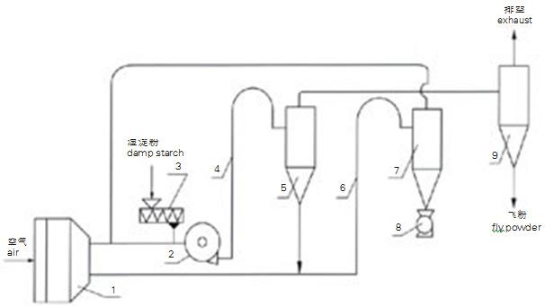 基本型氣流干燥設備,適用于松散狀、粘性小、成品為顆粒及粉末的物料。此流程示意為負壓氣流干燥,用戶可根據產品特性選擇正壓型式的干燥方法。