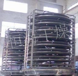 濕物料自加料器連續(xù)地加到干燥器上部第一層干燥盤上,帶有耙葉的耙臂作回轉(zhuǎn)運(yùn)動使耙臂作回轉(zhuǎn)運(yùn)動使耙葉連續(xù)地翻抄物料。物料沿指數(shù)螺旋線流過干燥盤表面,在小干燥盤上的物料被移送到外緣,并在外緣落到下方的大干燥盤外緣,在大干盤上物料向里移動并從中間落料口落如下一層小干燥盤中。大小干燥盤上下交替排列,物料得以連續(xù)地流過整個干燥器。中空的干燥盤內(nèi)通入加熱介質(zhì),加熱介質(zhì)形式有飽和蒸汽、熱水和導(dǎo)熱油,加熱介質(zhì)由干燥盤的一端進(jìn)入,從另一端導(dǎo)出。已干物料從最后一層干燥盤落到殼體的底層,最后被耙葉移送到出料口排出。濕份從物料中逸出,由設(shè)在頂蓋上的排濕口排出,真空型盤式干燥器的濕氣由設(shè)在頂蓋上的真空泵口排出。從底層排出的干物料可直接包裝。通過配加翅片加熱器、溶劑回收冷凝器、袋式除塵器、干料返混機(jī)構(gòu)、引風(fēng)機(jī)等輔機(jī),可提高其干燥的生產(chǎn)能力,干燥膏糊狀和熱敏性物 料,可方便地回收溶劑,并能進(jìn)行熱解和反應(yīng)操作。