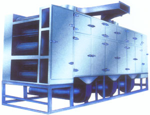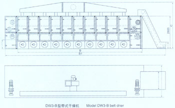 斗中的物料由加料器均勻地鋪在網帶上,網帶采用12-60目不銹鋼絲網,由傳動裝置拖動在干燥機內移動。干燥段由若干單元組成,每一單元熱風獨立循環,其