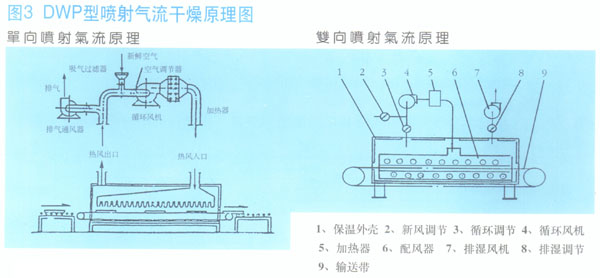 經分配器分配后。成噴射流吹向網帶,穿過物料后進入上腔。干燥過程是熱風氣流穿過物料層,完成熱量與質量傳達過程。上腔由風管與風機入口相連,大部分氣流